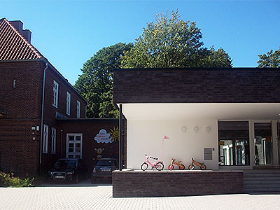 Links der alte und rechts der neue Gebäudeteil unserer schönen Kita.