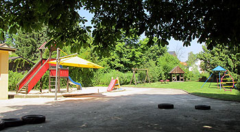 Das ruhig und geschützt gelegene Außengelände besteht aus einem großen Sandkasten mit Klettergerüst und Rutsche, aus einer gepflasterten Fläche (z. B. für Spielfahrzeuge) und einer Rasenfläche mit Schaukeln, Kletterhäusern, Wippe und einer überdachten Halle.